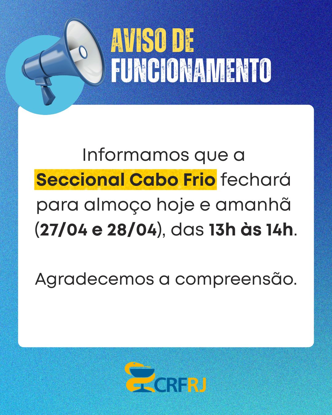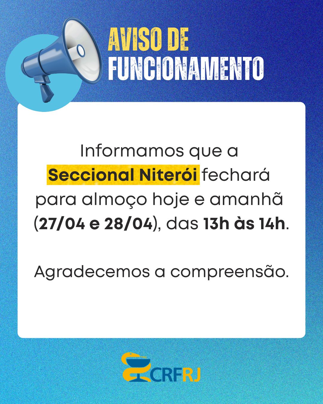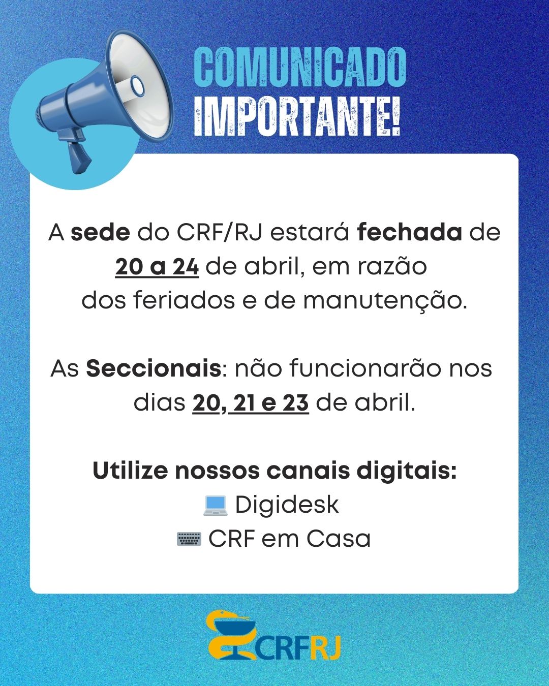 A Sede e as Seccionais do CRF/RJ não funcionarão nos dias 02 e 03 de abril!