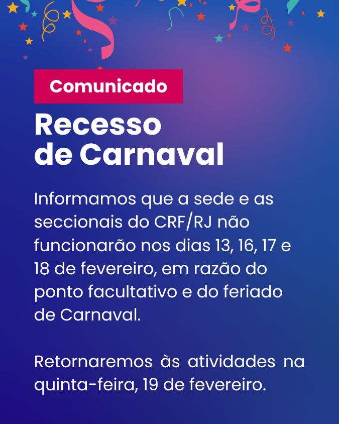 Devido ao Decreto Estadual e o feriado de carnaval, veja como será o funcionamento da Sede e Seccionais do CRF/RJ