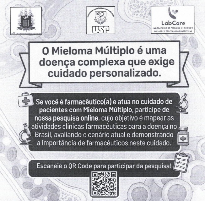 Participe da pesquisa 'Mapeamento dos Serviços Clínicos Providos por Farmacêuticos e Contribuições de Farmacêuticos ao Cuidado do Paciente com Mieloma Múltiplo no Brasil'