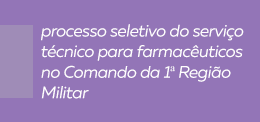 O Conselho Regional de Farmácia do Rio de Janeiro informa que foi divulgado o Aviso de Convocação para o Processo Seletivo do Serviço Técnico para Farmacêuticos e outros profissionais da área da saúde (FDV 2019/2020) do Comando da 1ª Região Militar.