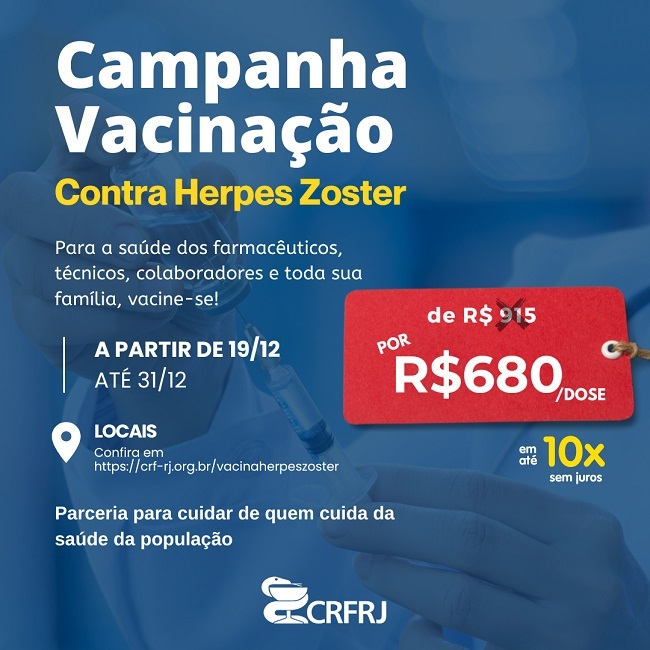 O CRF/RJ, por meio de uma parceria com farmácias participantes, está promovendo uma campanha para tornar a vacina contra o herpes zoster mais acessível para farmacêuticos e técnicos registrados no Conselho. O custo normal da vacina é de R$ 915,00, mas com a parceria, o valor será reduzido para R$ 680,00 por dose .