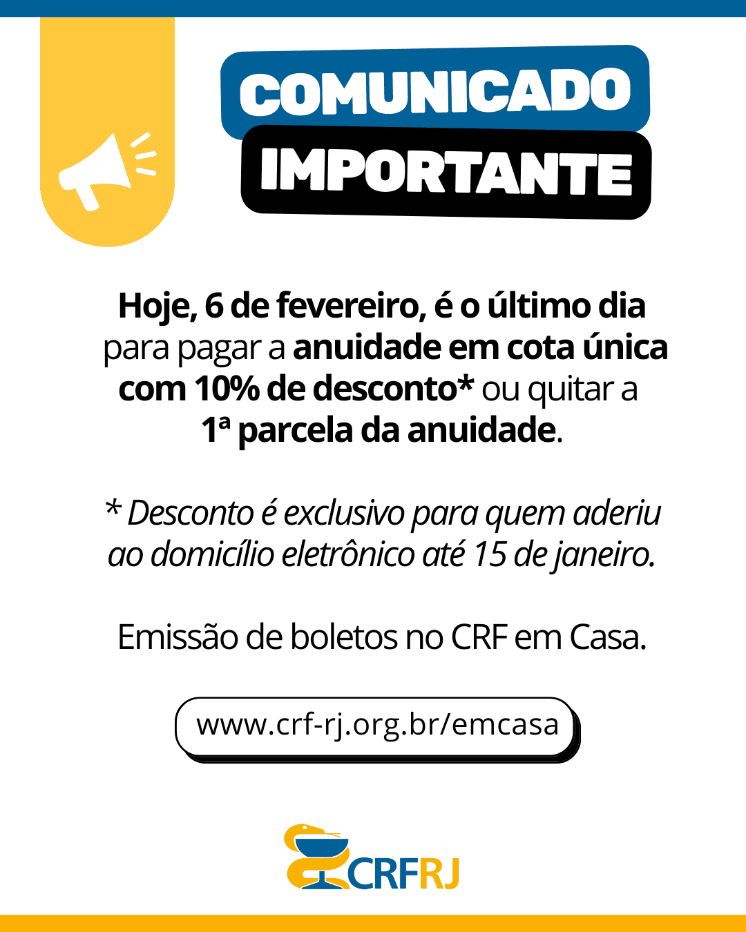 Último dia (6/2) para pagamento da anuidade em cota única com 10% de desconto ou da 1ª parcela