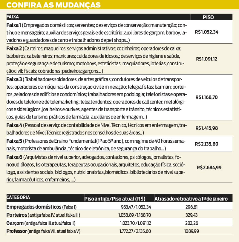 Com isso, as domésticas terão de receber mais R$ 296,61, valor referente ao retroativo dos meses de janeiro, fevereiro e março. Os porteiros — cujo piso subiu de R$ 1.058,89 para R$ 1.168,70 — receberão R$ 329,43 de atrasados. E os garçons terão R$ 202,26 a mais de diferença na próxima folha de pagamento. O piso da categoria mudou de R$1.023,70 para R$ 1.091,12.