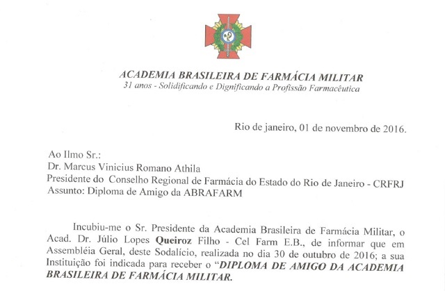 A Academia Brasileira de Farmácia Militar (Abrafarm) instituiu para a solênidade da entidade deste ano o "DIPLOMA DE AMIGO DA ACADEMIA BRASILEIRA DE FARMÁCIA MILITAR". Entre os agraciados estão o Conselho Regional de Farmácia do Estado do Rio de Janeiro (CRF-RJ) e Associação dos Farmacêuticos do Estado do Rio de Janeiro (Afaerj).