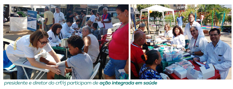 Também como parte das ações alusivas ao Dia Nacional pelo Uso Racional de Medicamentos, a presidente do CRF/RJ, Dra. Tania Mouço, junto ao Dr. Ricardo Lahora, diretor Secretário Geral, participaram de Ação Integrada em Saúde promovida pela Clínica Da Família Cypriano das Chagas Medeiros, realizada na Praça de Coelho Neto.