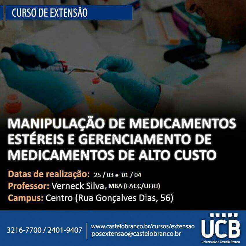 Nos próximos dias 25/03 e 01/04, o Dr. Verneck Silva, da Câmara Técnica de Oncologia do CRF-RJ, ministra o curso de extensão em Manipulação de Medicamentos Estéreis e Gerenciamento de Medicamentos de Alto Custo, no Campus Centro da Universidade Castelo Branco.