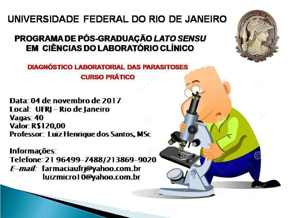 Acontece em 4 de novembro, na Universidade Federal do Rio de Janeiro (UFRJ), o curso "Prático Diagnóstico Laboratorial das Parasitoses". Estão disponíveis apenas 40 vagas. As aulas serão ministradas pelo Dr. Luiz Henrique dos Santos, que integra a Câmara Técnica de Análises Clínicas do CRF-RJ. O valor do investimento é R$ 120,00.
