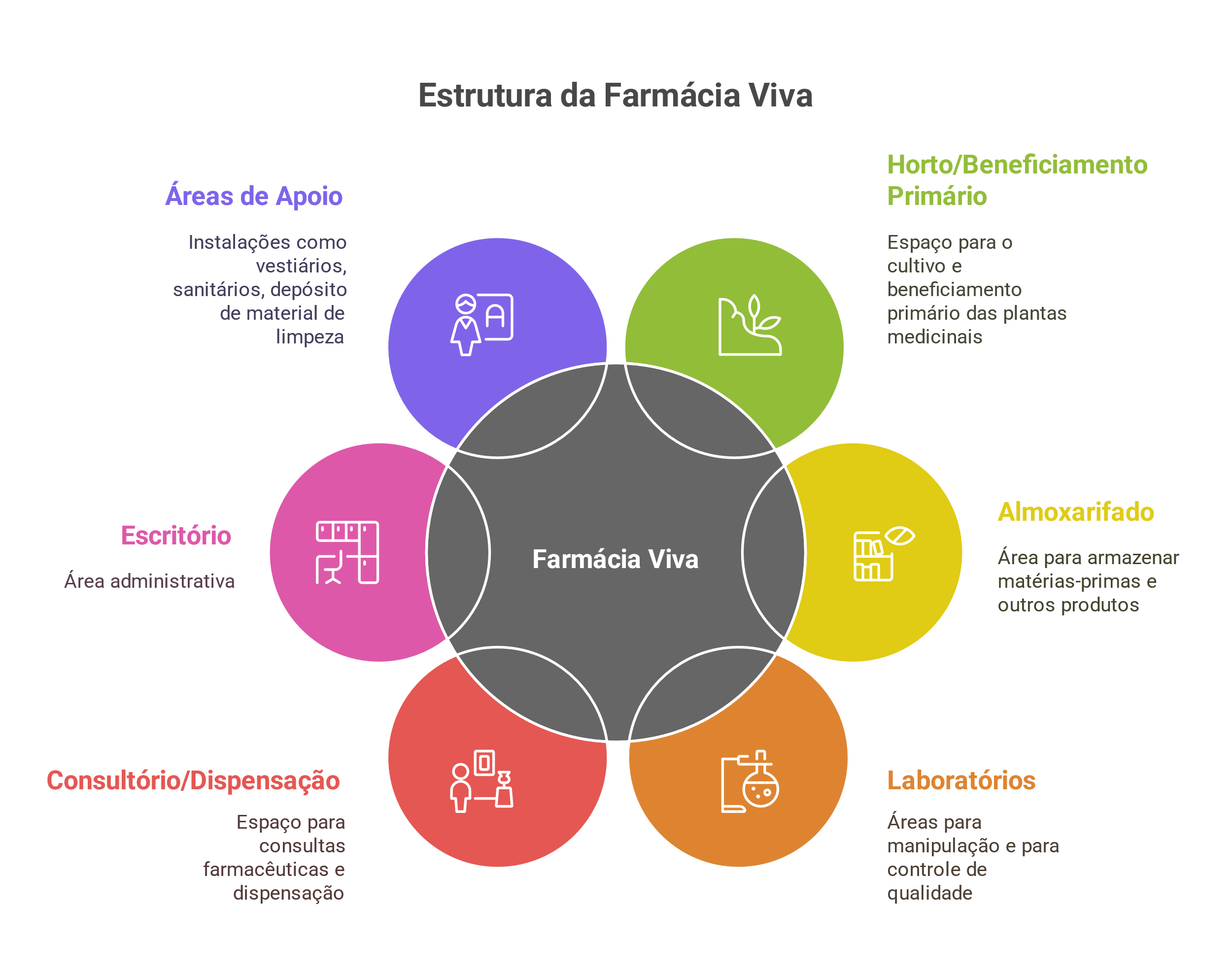 Esses espaços incluem: horto para o cultivo das plantas medicinais, almoxarifado para o armazenamento das plantas e produtos fitoterápicos, laboratório de manipulação e controle de qualidade, consultório farmacêutico ou sala de dispensação, escritório administrativo, áreas de apoio como vestiários, sanitários e depósito de material de limpeza.